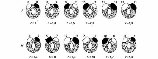 Рис. 20. Количественный метод оценки поддельного яйца. Кружком обозначено гнездо с одним яйцом внутри него и двумя поддельными яйцами на краю. Числа 7, 8, 9, 10, 11, 12 выражают величину поддельных яиц, r -отношение величин поддельных яиц на краю гнезда. X - модель, подлежащая измерению. Поддельное яйцо, выбранное для каждой пробы, обозначено черным цветом.