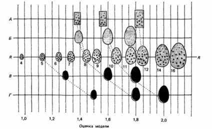 Средние значения для разных поддельных яиц даны по отношению к ряду стандартных размеров R. Поддельные яйца: А - коричневые с крапинками, в форме кирпичиков; Б - коричневые без крапинок, яйцевидные; В - зеленые без крапинок, яйцевидные; Г - зеленые с крапинками, яйцевидные. Числа от 4 до 16 -величина яйца. Равные расстояния между точками на этой шкале указывают на равные значения г.