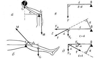 Рис. 2. Костные рычаги: а — двуплечий, 6 — одноплечий; вращающая составляющая (Ft) и укрепляющая (FH) силы при углах ее приложения: в — в прямом, г — тупом, д — остром