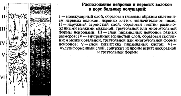 Кора больших полушарий головного мозга — это наиболее развитый отдел головного мозга, который покрывает полушария снаружи. Она представляет собой тонкий слой серого вещества. Полушария состоят из белого вещества. Толщина коры 1,5...Змм; 6 слоев — I...VI.