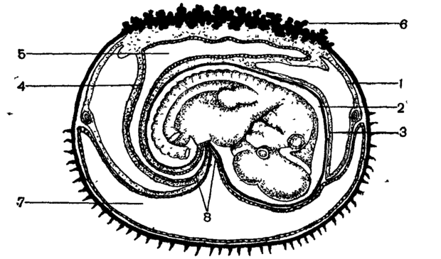 Плацента. Во время развития эмбриона в матке млекопитающих формируется крайне характерное для них образование, известное под названием детского места или плаценты (рис.12). Только у однопроходных плацента отсутствует. У сумчатых есть зачатки плаченты. Плачента возникает путем срастания наружной стенки аллантоиса с серозой, в результате чего формируется губчатое образование – хорион. Хорион образует выросты – ворсинки, которые соединяются или срастаются с разрыхленным участком эпителия матки. В этих местах кровеносные сосуды детского и материнского организмов сплетаются (но не сливаются), и таким образом устанавливается связь между кровяными руслами эмбриона и самки. В результате этого обеспечивается газообмен в теле зародыша, его питание и удаление продуктов распада.