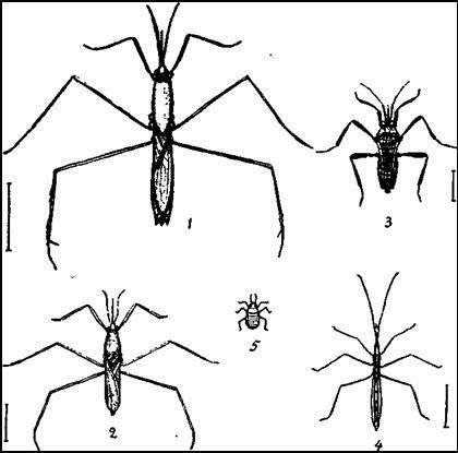 Рис. А.5. Водомірки. 1 – водомірка велика (Gerris rufoscutellatus); 2 – водомірка панцирна (Gerris thoracicus); 3 – велія (Velia currens); 4 – водомірка-паличка (Hydrometra gracilenta); 5 – водомірка мала (Microvelia reticulata) 1- 4 – зменшений вигляд, 5 – збільшений вигляд.