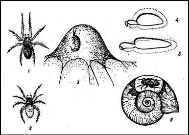 Рис. А.2. Водяний павук (Argyroneta aquatica): 1 – самець; 2 – самка; 3 – підводна лялечка павука, підвішена до павутини; 4 – контур тіла самки з міхурцем повітря; 5 – контур тіла самця з міхурцем повітря; 6 – раковина котушки, що служить зимовим сховищем павука