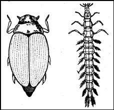Рис. А. 8. Вертячка (Gyrinus). Зліва – дорослий жук; справа – личинка