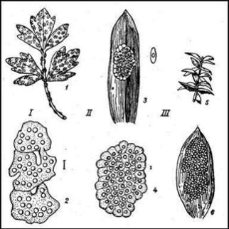 Рис. А.4. Кладки водяних кліщів: I – яйця Piona carnea: 1 – багато кладок на листі лютика; 2 – три кладки в збільшеному вигляді; II – яйця Hydryphantes; 3 – кладка в збільшеному вигляді; 4 – та ж кладка при ще збільшеному вигляді.; III – кладка Linnochares aquatica; 5 – в природному вигляді на листі елодеї; 6 – та ж кладка в збільшеному вигляді