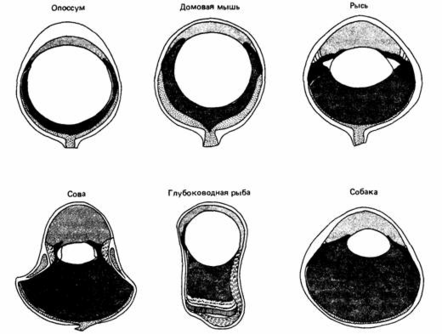 Рис.1. Сравнение глаз ночных животных и собаки, обладающей дневным и ночным зрением.