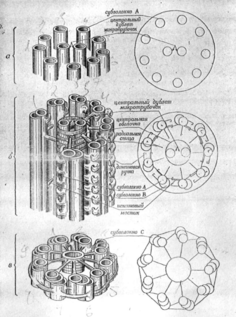 Структурная организация ресничек и жгутиков практически во всех исследовавшихся клетках отличается удивительным единообразием: центральную пару микротрубочек окружает кольцо из микротрубочек (обычно парных). Микротрубочки связаны между собой поперечными мостиками; вся конструкция называется аксонемой жгутика. Расположение микротрубочек и мостиков в аксонеме изучено в настоящее время довольно подробно; оно схематически представлено на рис. 6. В центре находится пара микротрубочек, окруженных общей оболочкой из белковых колец, плоскость которых наклонена к оси аксонемы. Стенка каждой из центральных микротрубочек образована тринадцатью продольными рядами (протофибриллами) белковых субъединиц. Эту центральную структуру, окружают девять расположенных по кольцу пар микротрубочек. В каждом дублете одна микротрубочка (основная или А) имеет полностью замкнутую стенку, состоящую из 13 протофибрилл (рис. 7); другая микротрубочка (микротрубочка В) имеет серповидное сечение и примыкает к микротрубочке А, так что ее стенка состоит из меньшего числа протофибрилл, обычно из 10. Каждая микротрубочка А соединена с микротрубочкой В соседнего дублета с помощью мостика из белка, называемого нексином. От обращенной внутрь поверхности микротрубочки А отходит по направлению к центру белковый выступ — так называемая радиальная спица. Вдобавок каждая микротрубочка А имеет двойной ряд боковых ручек (их длина около 14 нм), построенных из белка (динеина) и направленных к соседнему дублету. Все эти выступы расположены с определенной периодичностью относительно оси микротрубочки А и, как будет видно из дальнейшего, играют очень важную роль в генерации движения. Описанное выше строение аксонемы соответствует всей средней части жгутика, т. е. за исключением его концевой части и основания, где аксонема устроена несколько иначе. На самом конце центральная пара микротрубочек обычно длиннее, чем окружающие ее периферические дублеты, так что жгутик на конце заострен. Нередко микротрубочки В бывают короче микротрубочек А, и периферические дублеты вблизи конца жгутика переходят в одиночные трубочки (рис. 6). На одиночных микротрубочках А в этой области жгутика выступов нет.
