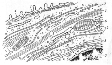 Рисунок 4. «Схематическое изображение цитоскелетных компонентов клеток». 1 – микрофиламенты; 2 – микротрубочки; 3 – промежуточные филаменты; 4 – плазмалитическая мембрана; 5 – ядро; 6 – митохондрии; 7 – рибосомы.