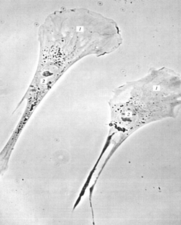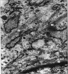 Рисунок 3. «Поляризованные движущиеся фибробласты в культуре ткани». 1 – ламеллоплазма; 2 — ядро