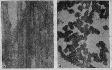 Рисунок 5. «Электронные, микрофотографии микротрубочек в краевых областях эритроцитов тритона»: а — продольный срез, на котором: видна линейная упаковка субъединиц в микротрубочках; б—поперечный срез; видно, что стенка каждой микротрубочки образована тринадцатью субъединицами. Негативное окрашивание. ×200 000.