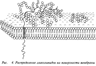 Несмотря на большую подвижность ганглиозидов, они не вносят хаотичность в распределение компонентов мембраны. Это достигается, во-первых, образованием горизонтальных связей между олигосахаридными цепочкам гликопротеинов и гли-колипидов, приводящих к устойчивому полимерному комплексу. Во-вторых, гликолипиды и гликопротеины могут сцепляться периферическими гликозаминогликанами, которые, как правило, не закреплены в интегральной зоне мембраны, свободно диффундируют и взаимодействуют с гликолипидами и глико-протеинами ионными и водородными связями, образуя своеобразный латекс. В-третьих, ограничение латерального движения гликолипидов достигается сосредоточением их в определенных областях с повышенной вязкостью. В-четвертых, топографию поверхности стабилизируют цитоскелетные системы клетки.
