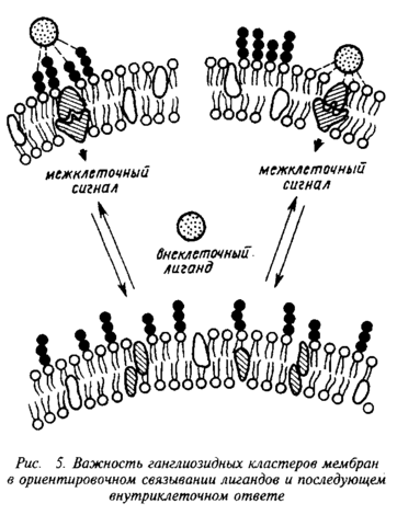 Участки, занятые заряженными ганглиозидными молекулами, имеют повышенное сродство к водорастворимым, экзогенным лигандам, а области, свободные от ганглиозидов, осуществляют гидрофобное взаимодействие с лигандами другой природы. Оба рода взаимодействия вызывают кооперативные и некооперативные структурные перестройки в мембране, оказывают разнообразные влияния на состояние клетки.