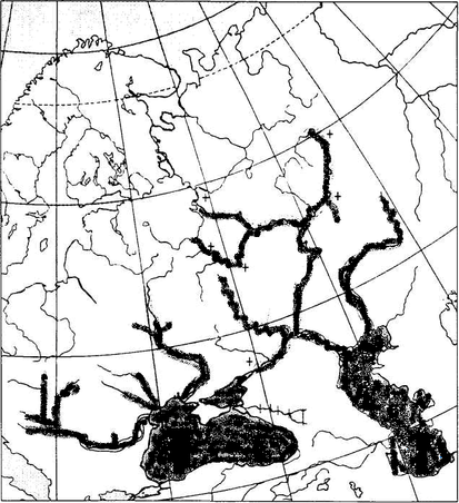 Рис. 2. Ареал обитания белуги (+ – места археологических находок остатков белуги, черная штриховка – ареал обитания белуги.)