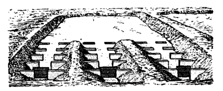 Садки для выдерживания производителей расположены в наименее шумном месте завода. Они стационарные и земляные. В верхней части каждого садка (пруда) имеется по три нерестовых канавы, а в нижней части – водоспуск (рис. 10). Ширина садка – 12 м, длина – 35 м (без канав), глубина –0,5 – 1 м. Нерестовые канавы делают длиной 25 м и шириной по дну 0,8 м. Дно и откосы их покрыты гравием и ракушкой слоем 15 – 20 см. Дно канав имеет уклон в сторону садка. Глубина в верхней части канав – 15 см, а в нижней –45 см. Канава имеет четыре переката, на которых уложена галька слоем в 3 –7 см. Через каждые 5 м канава разделена съемными решетками на отсеки. Вода поступает из отстойника в канал, из которого она подается в канавы. Это обеспечивает подачу не мутной воды и отсутствие резких температурных ее колебаний, что наряду со скоростью ее течения в канавах не менее 0,5 – 0,7 м/с положительно влияет на созревание половых продуктов производителей рыбца.