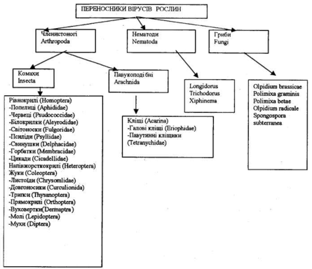 Переносниками вірусів рослин є членистоногі, нематоди та гриби (рис. 2.). Кожен вірус звичайно має своїх переносників, що належать, як правило, до однієї таксономічної групи. Представники двох класів членистоногих — комахи (Insecta) та павукоподібні (Arachnida) можуть переносити віруси рослин. Безумовний інтерес привертає до себе ряд Homoptera, куди відносяться такі важливі переносники вірусів рослин, як цикади, попелиці та білокрилки.