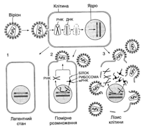 1 — заражена клітина перебуває в латентному стані; 2 - у клітині починається помірне розмноження вірусу; 3 — лізис (руйнування) клітини і вихід вірусних частинок назовні. Інфекція ВІЛ починається з того, що вібріон приєднується до сприйнятливої клітини. При цьому оболонка вірусу і мембрана клітини зливаються так, що серцевина вірусної частинки, яка містить крім білків генетичний матеріал вірусу — РНК, опиняється в цитоплазмі клітини. Тут зворотна транскриптаза, яка міститься в серцевині, синтезує одноланцюгову ДНК, комплементарну вірусній РНК. Далі ця РНК розщеплюється і синтезується другий ланцюг, що є комплементарним першому. Дволанцюгова вірусна ДНК (провірус) проникає в ядро і вбудовується в хромосомну ДНК клітини. В такій латентній (прихованій) формі вірус може існувати, не виявляючи себе, тривалий час (1). У випадку активації провірусу, за допомогою клітинного механізму транскрипції утворюються РНК-копії провірусу і мРНК. За цими мРНК на рибосомах клітини синтезуються вірусні білки, з них і РНК-копій формуються нові віріони. Вони покидають клітину, відбруньковуючись від її поверхні. Якщо репродукція ВІЛ відбувається помірно, то заражена клітина може залишатися цілою і життєздатною (2). Якщо ж реплікація вірусу буде дуже інтенсивною, то відбувається руйнування (лізис) клітини, і вона гине (3)