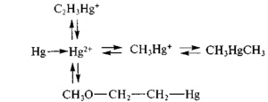 Более распространена трансформация соединений ртути, протекающая в условиях дефицита кислорода под влиянием микробиологических процессов и приводящая к образованию метил-ртути CH3Hg+, которая переходит в диметилртуть (CH3)2Hg. Диметилртуть – труднорастворимое, но легко испаряющееся соединение. Она активно эманирует в атмосферу, где под воздействием радиации вновь превращается в монометилртуть и сорбируется аэрозолями.