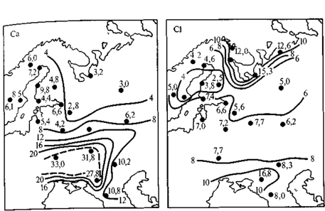 Рис. 6. Годовое количество (кг/га) ионов кальция и хлора, поступающих на поверхность почвы с атмосферными осадками на территорию Восточной Европы