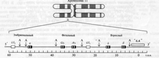 Рис1.1. Родина β -глобинових генів людини розташована в хромосомі 11. Величина представленого фрагмента хромосоми близько 60 т.п.н. Він містить п'ять функціонально активних генів (ε, Gγ, Gγ, δ и β) і два псевдогена (Ψβ2 и Ψβ2). Буквою А позначені положення Аlu-повторів-послідовностей, повторених у геномі людини близько 300 000 разів.