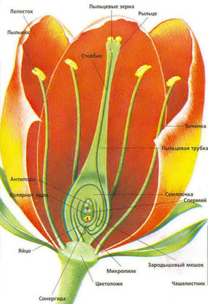 Структура семязачатка до оплодотворения включает в себя семяножку (фуникулус), плаценту, два интегумента и нуцеллус. Плацента это место прикрепления семяножки к завязи. Внутренняя часть семязачатка - нуцеллус покрыта двумя покровами - интегументами, внешним и внутренним. Интегументы на верхушке семязачатка не смыкаются, образуя микроскопическое отверстие - пыльцевход, или микропиле. Часть нуцеллуса, обращенного к микропиле, называют микропилярным полюсом, а противоположную сторону - халазой, или халазальным полюсом.