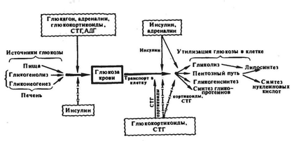 Рис 3. Гормональная регуляция углеводного гомеостаза: сплошными стрелками обозначена стимуляция эффекта, пунктирными — торможение