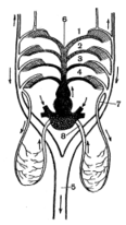 Схема артеріального кровообігу двоякодишної риби: 1–4 – перша-четверта пари жаберних артеріальних дуг; 5 – спинна аорта; 6 – брюшна аорта; 7 – легенева артерія; 8 – легенева вена.