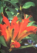 У колумнеї Бенкса темно-зелені гладкі, покриті воском листки і червоно-жовті квітки.