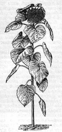 Стебло соняшника заповнене губчастою паренхімою, інколи трохи розгалужується у верхній частині. Висота стебла 1,5 - 4 м і більше. На стеблі розташовані великі листки серцеподібної форми, з черешками. Надземна частина рослини опушена грубими волосками.