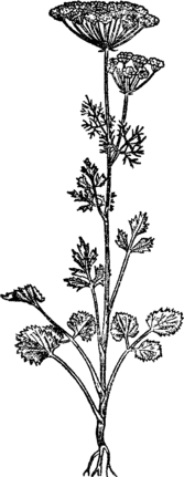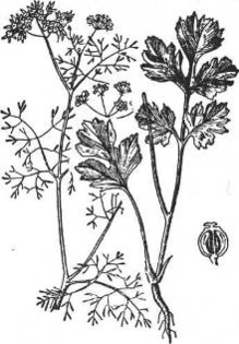 Однорічна трав'яниста рослина родини зонтичних висотою 20 - 80 см. Корінь тонкий, веретеноподібний. Стебло пряме, борознисте, гіллясте. Нижні прикореневі листки лопатеві, округлосерцеподібні. на довгих черешках, верхні - три-... роздільні з лінійними часточками. Сидячі [1].