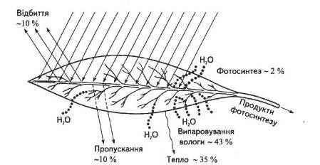 Загальна листкова поверхня рослин помірної зони, розміщених на 1 га орної площі, майже в п'ять разів перевищує земельну ділянку, а в південних районах з нормальним зволоженням — у 10... 15 разів. Різноманітна їхня форма, розташування на стеблі, фото-тропічна реакція забезпечують виконання найважливішої функції — поглинання світлових променів. Як і всі фізичні тіла, листок відбиває, поглинає та пропускає промені, що падають на нього (рис. 3).