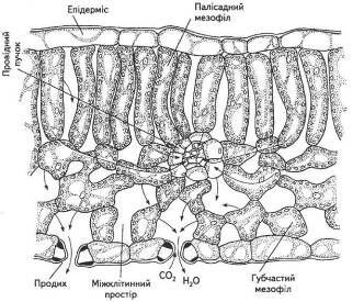 Найбільше хлоропластів мають клітини палісадної або, як її ще називають, стовбчастої паренхіми (кілька десятків на одну клітину). Ці клітини щільно прилягають одна до одної, на відміну від пухко розміщених клітин губчастого мезофілу. Від 15 до 20 % загального об'єму листка становить міжклітинний простір, наявність якого характерна насамперед для губчастої паренхіми. Завдяки міжклітинникам значно зростає внутрішня поверхня листка (вона в 7... 10 разів більша за зовнішню поверхню), створюється відповідне співвідношення газового складу, яке відрізняється від атмосферного, хоча міжклітинний простір і поєднується з повітрям атмосфери через продихи. Саме за рахунок міжклітинного простору СО2 постійно надходить з атмосфери, бо губчаста тканина мезофілу розміщується поблизу нижнього епідермісу, де розташовані численні продихи.