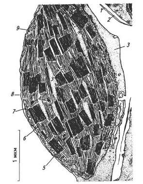1 — зовнішня оболонка; 2— внутрішня оболонка; 3 — строма; 4 — краплини ліпідів; 5— грана; 6 — тилакоїди строми; 7 — крохмальні зерна; 8 — оболонка хлоропласта; 9 — рибосоми