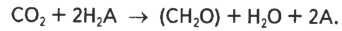 В цьому рівнянні Н2А може бути водою або іншим відновником. Отже, бактерії, здатні до фотосинтетичної асиміляції СО2, за винятком ціанел, використовують H2S, H2, СН3, а тому в процесі фотосинтезу не виділяють кисень. Такий тип фототрофного живлення дістав назву фоторедукції. Для вищих рослин і водоростей Н2А — це вода. Інакше кажучи, Ван Ніль припустив, що саме вона, а не вуглекислий газ розкладається в процесі фотосинтезу. Отже, рівняння фотосинтезу тепер матиме такий вигляд: