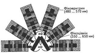 Слід зазначити, що на відміну від хлорофілів і каротиноїдів, локалізованих у ламелах, фікобіліни концентруються або в стромі, або формують особливі впорядковані ансамблі на поверхні мембран — фікобілісоми (рис. 10).