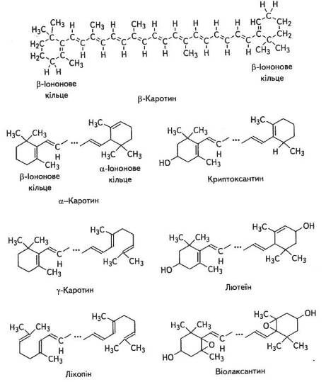 Поряд із зеленими пігментами в хлоропластах є й такі, що належать до групи каротиноїдів. Каротиноїди — це найпоширеніші в рослинному світі жиророзчинні жовті, оранжеві та червоні пігменти аліфатичної будови. Вони є обов'язковим компонентом фотосинтетичного апарату. За хімічною природою всі вони — полімери вуглеводню і складають ланцюг із 40 вуглецевих атомів (рис. 4.9), побудований з 8 залишків ізопрену.