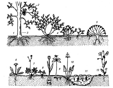 Рис. 1. Життєві форми рослин за Раункієром: 1-3 — фанерофіти; 4, 5 — хамефіти; 6, 7 — гемікриптофіти; 8-11 — криптофіти; 12 — терофіти; 13 — насіння із зародком.