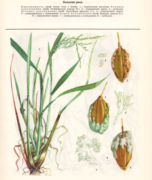 Карликовость (Приложение 4). Специфическое вирусное заболевание. В СССР встречается редко, но в Японии, Китае, Индии и других странах Юго-Восточной Азии эта болезнь широко распространена и вызывает недобор урожая зерна до 15%.