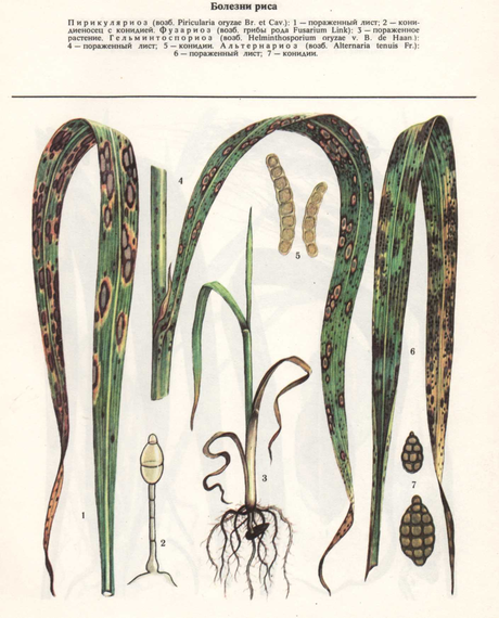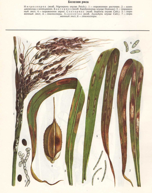 Нигроспороз (Приложение 3) распространен во всех районах рисосеяния. Обычно проявляется в период созревания риса на листьях, метелках и семенах в виде черного порошкообразного налета. Поражает также кукурузу и сорго.