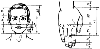 Сумма двух первых фаланг пальца в соотношении со всей длиной пальца и дает число золотого сечения (за исключением большого пальца).