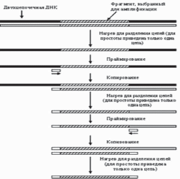 В основе метода ПЦР лежит способность хорошо известных в молекулярной биологии ферментов, ДНК-полимераз, осуществлять направленный синтез второй, т.е. комплементарной (спаренной) цепи ДНК, по имеющейся матрице одноцепочечной ДНК, наращивая небольшую олигонуклеотидную затравку (праймер), комплементарную участку этой матрицы, до размеров в несколько тысяч или даже десятков тысяч звеньев. Повышая температуру, можно добиться остановки реакции и последующей денатурации полученной ДНК, т.е. разделения цепей полученной в ходе реакции двуцепочечной ДНК. Если в реакционной смеси присутствует избыток праймера, то, значительно снизив температуру, чтобы праймер мог вновь связаться с тем же самым комплементарным участком ДНК, и добавив новую порцию фермента, можно вновь установить температуру, необходимую для реакции полимеризации, и, таким образом, проведя реакцию еще раз, увеличить количество ранее полученного продукта. Многократное, или как говорят, циклическое повторение этой процедуры позволяет наработать значительное количество копий участка ДНК, начинающегося с данного праймера. Один цикл ПЦР осуществляется за 1–2 мин, так что в течение нескольких часов можно получить 100 млрд. копий (рис. 2).
