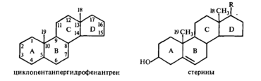 Большой класс стероидов характеризуется наличием в молекуле специфического циклического скелета — циклопентанпергидрофенантрена, построенного из четырех колец, три из которых шестичленные (А, В и С) и одно — пятичленное (D). Для обозначения различных положений этого кольца принята следующая нумерация. К стеринам (стеролам) относятся стероиды, несущие в положении С-3 гидроксильную группу: