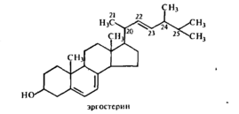 Эргостерин по структуре отличается от холестерина дополнительной метильной группой в боковой цепи при С-24, а также имеет две дополнительные двойные связи: одна из них при С-7, другая в боковой цепи при 22- и 23-углеродных атомах. Эргостерин является провитамином витамина D. Строение эргостерина было установлено в 1934 г.