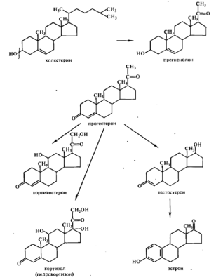 Прегненолон является также предшественником мужских половых гормонов (тестостерона) и женских половых гормонов (эстрогенов — эстрона, эстрадиола). В коре надпочечников прогестерон превращается в кортикостерон и кортизол (гидрокортизон): секреция кортизола достигает у взрослого человека 15—30 мг в день. Эти вещества были первоначально выделены из коры надпочечников в кристаллическом виде.
