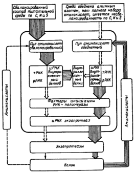 Истощение среды в процессе роста культуры по одному или нескольким субстратам приводит к снижению уровня пула внутриклеточных свободных аминокислот, что значительно снижает синтез РНК. В результате освобождаются РНК-полимераза и факторы инициации транскрипции РНК. Увеличиваются частота инициации иРНК экзопротеаз и соответственно синтез внеклеточных протеолитических ферментов (правая сторона схемы). При наличии в среде белков экзопротеазы расщепляют их до пептидов и аминокислот, которые поступают в клетку, пополняя ее пул. Аминокислоты утилизируются клеткой активно и являются лимитирующим субстратом. Поступающие в клетку аминокислоты могут полностью удовлетворить ее потребности, т. е. снять лимитирование по этому субстрату, что приведет к временному торможению биосинтеза экзопротеаз и т. д. Иными словами, имеет место механизм контроля синтеза экзопротеаз по типу метаболитной репрессии. Можно предположить, что регуляторное воздействие субстратов на биосинтез экзопротеаз проявляется на уровне транскрипции. Известно, что пул иРНК поддерживает синтез протеаз в течение нескольких часов.