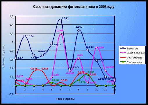 В общем можно заметить одновременные периодические всплески численности сразу нескольких отделов микроводорослей. Явный пик вегетации зеленых водорослей хорошо прослеживается на диаграмме. Немного смещены от него во времени небольшие всплески численности сине-зеленых и диатомовых. Также наблюдается небольшой подъем численности зеленых и сине-зеленых в июне с опережающей их вспышкой численности диатомовых.