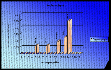 Представители отдела Euglenophyta встречены в пробах еще реже диатомовых. Только в 5 пробах были зарегистрированы небольшие вспышки численности евгленовых. Впервые микроводоросли данного отдела были обнаружены в пробе за 3 июля и периодически встречались до начала сентября (диаграмма 6).