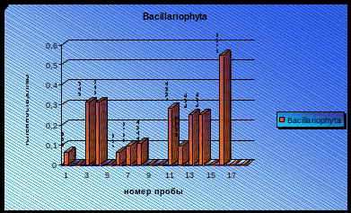 Колебания численности диатомовых проявляются хорошо и периодически снижаются до нуля. Из 18 проанализированных проб в 7 не было обнаружено водорослей данного отдела. Достаточно высокий уровень вегетации диатомовых был зарегистрирован в июньских пробах. В этот период наблюдалась вегетация видов Asterionella formosa Hass, Fragillaria construens (Ehr) Grum var. Subsalina Hust, Pinnularia bigibba Ehr. Var. mesogondyla f. interrupta, Synedra tabulata (Ag) Kütz tabulate и Melosira islandica O. Müll subsp. islandica Hust. Далее, с июня по август, встречались лишь отдельные представители отдела диатомовых, не вносящих большого вклада в общий уровень вегетации водорослей. Только в начале сентября вновь повысился уровень вегетации диатомовых. Он продержался на невысоком уровне до конца сентября и вылился в самую крупную вспышку численности диатомовых, вызванную развитием представителей родов Amphora, Opephora, Pinnularia и Navicula (диаграмма 5).