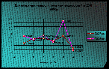 Численность зеленых водорослей в мае, июне и сентябре 2008 года превышает уровень вегетации представителей этого отдела за тот же период 2007 года. Но максимумы их развития практически совпадают во времени и приурочены к сентябрю. Можно отметить, что всплеск численности в 2008 году был более сильным, чем в 2007 году, что обусловлено более благоприятным температурным режимом в 2008 году.