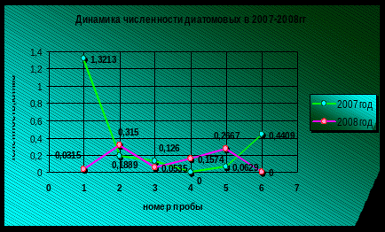 Рассматривая общую картину динамики фитопланктона в 2007-2008гг, можно отметить, что в среднем уровень вегетации микроводорослей в 2008 году превышает численность фитопланктона в 2007 году лишь в августе и сентябре.