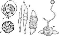 Первые из них одноклеточные и бывают двух типов— спорангиеспоры (неподвижные), покрытые оболочкой, и зооспоры — подвижные с одним-двумя жгутиками. Вместилища спорангиеспор называются спорангиями, а выросты, на которых они развиваются,— спорангиеносцами. У зооспор—соответственно зооспорангии и зооспорангиеносцы.